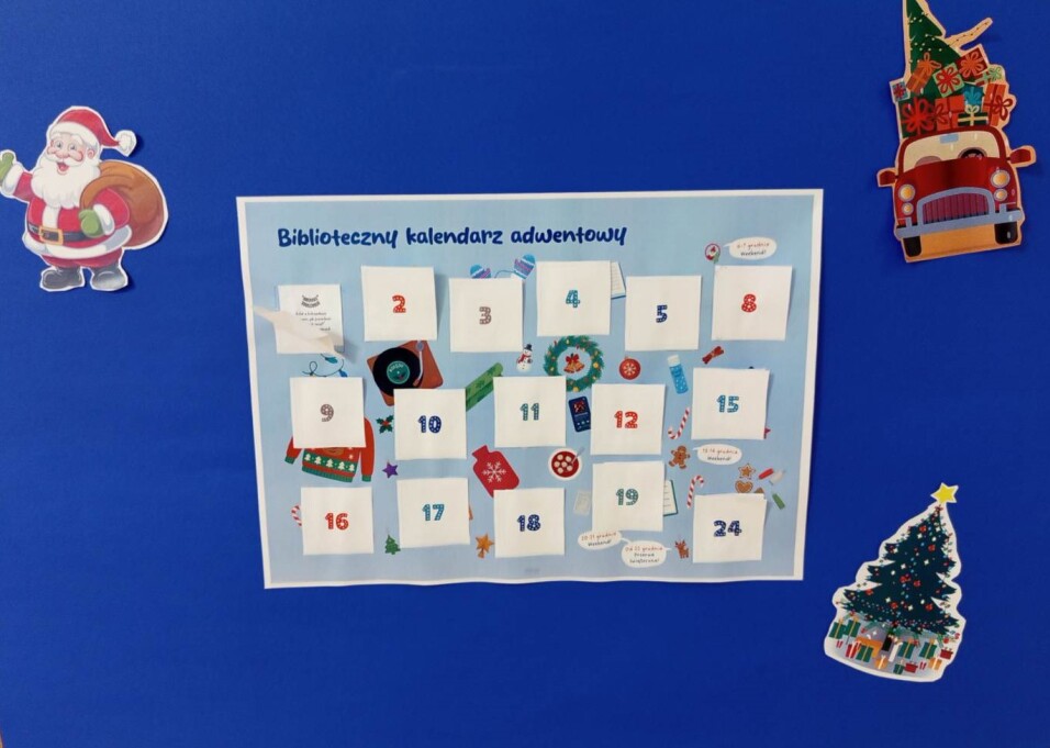 W poniedziałek, 1 grudnia w bibliotece szkolnej pojawił się kalendarz adwentowy przygotowujący uczniów do świąt Bożego Narodzenia. Ten specjalny rodzaj kalendarza pomaga odliczać kolejne dni i wyczekiwać na święta Bożego Narodzenia. Uczy on umiejętności wyczekiwania, wspólnie spędzonego czasu, jest okazją do rozmów i odpowiedzi na niecodzienne pytania, pokazuje uczniom ważne w życiu wartości oraz porządkuje czas.