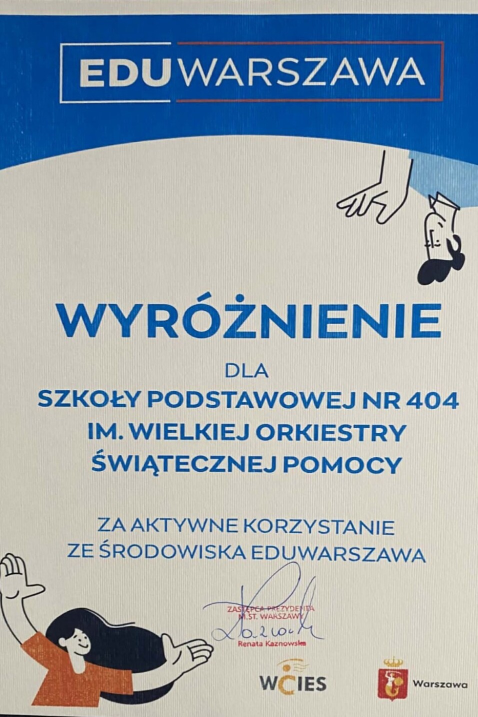 Warszawskie szkoły od 6 lat pracują w cyfrowym środowisku Eduwarszawa, początkowo głównie obsługując nauczanie zdalne podczas pandemii, obecnie organizując komunikację i współpracę między nauczycielami oraz nauczycielami i uczniami. Spośród wawerskich placówek wyróżnia się Szkoła Podstawowa nr 404 im. Wielkiej Orkiestry Świątecznej Pomocy, której zaangażowanie doceniło Biuro Edukacji. Na konferencji Eduwarszawa 2026 16 marca z rąk wiceprezydent Renaty Kaznowskiej nagrodę dla szkoły przyjęła dyrektor Monika Prochot. W SP404 na cyfrowy sukces złożyły się kompetencje i innowacyjność nauczycieli, sprawna organizacja oraz bogate wyposażenie nowej szkoły. Nagroda finansowa towarzysząca wyróżnieniu posłuży do zakupu kolejnych wartościowych materiałów zwiększających atrakcyjność nowoczesnej edukacji.