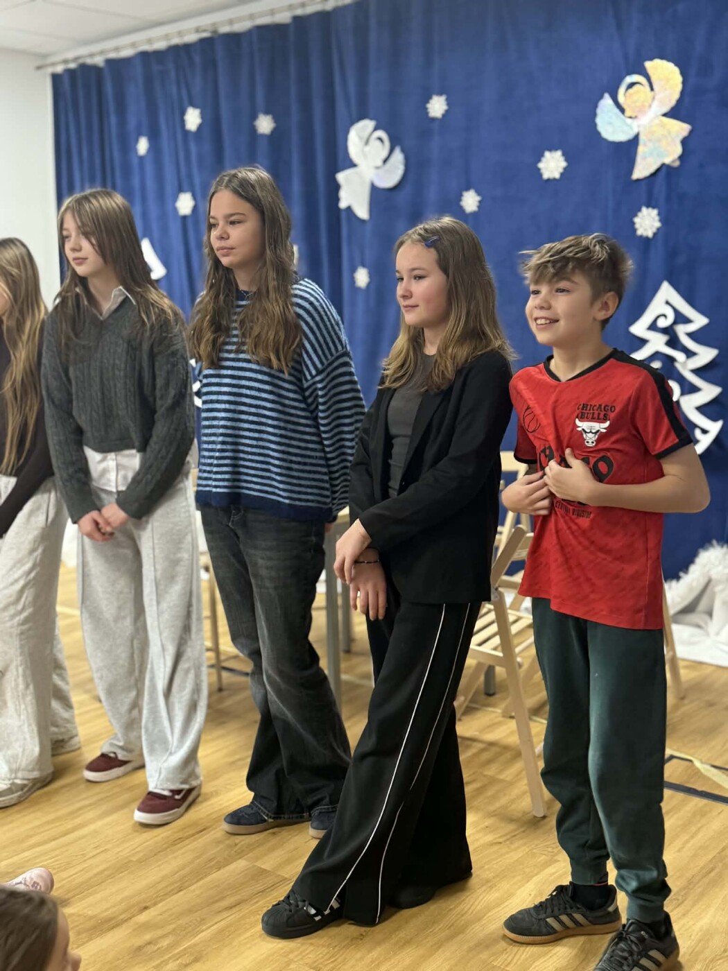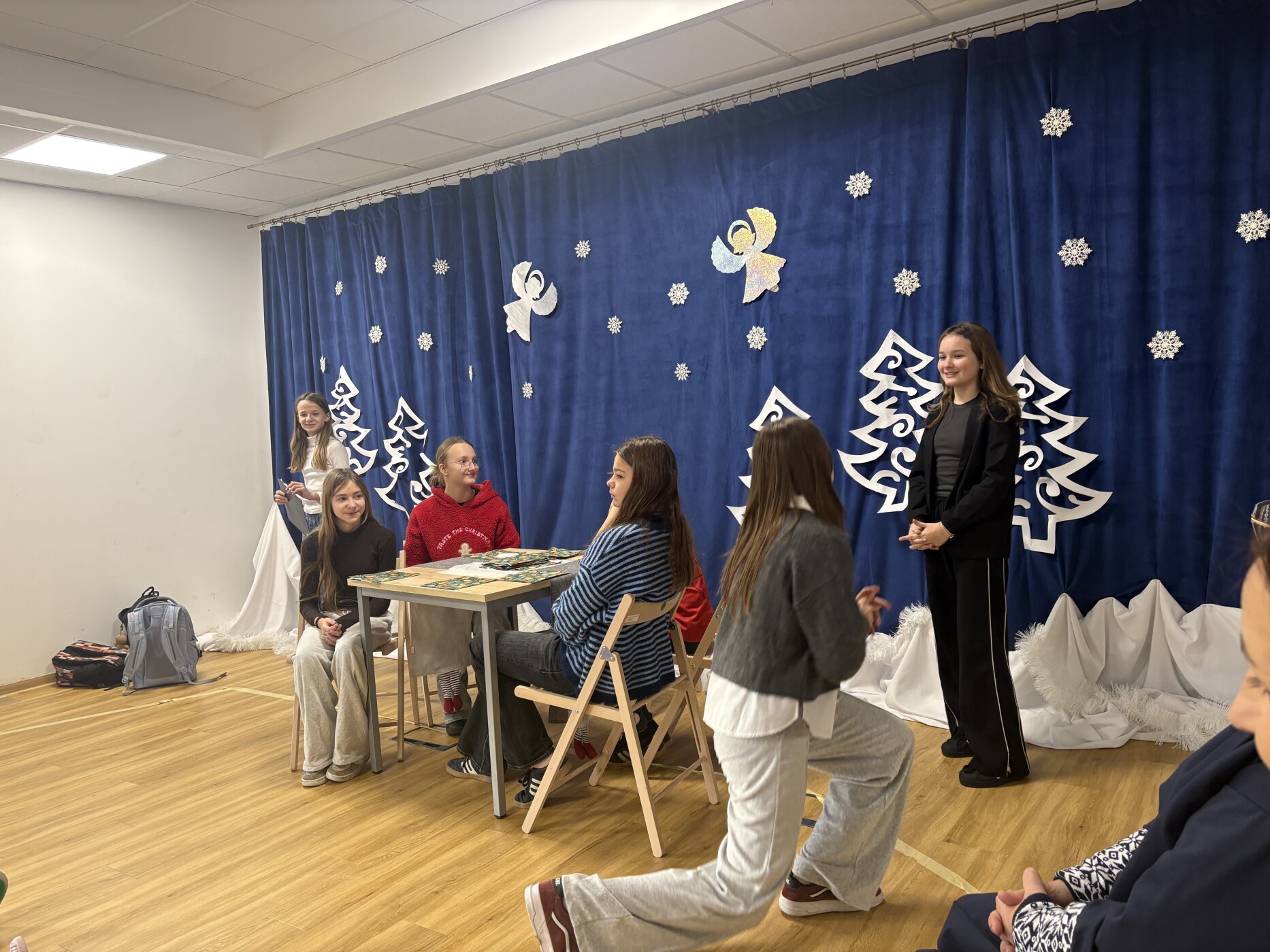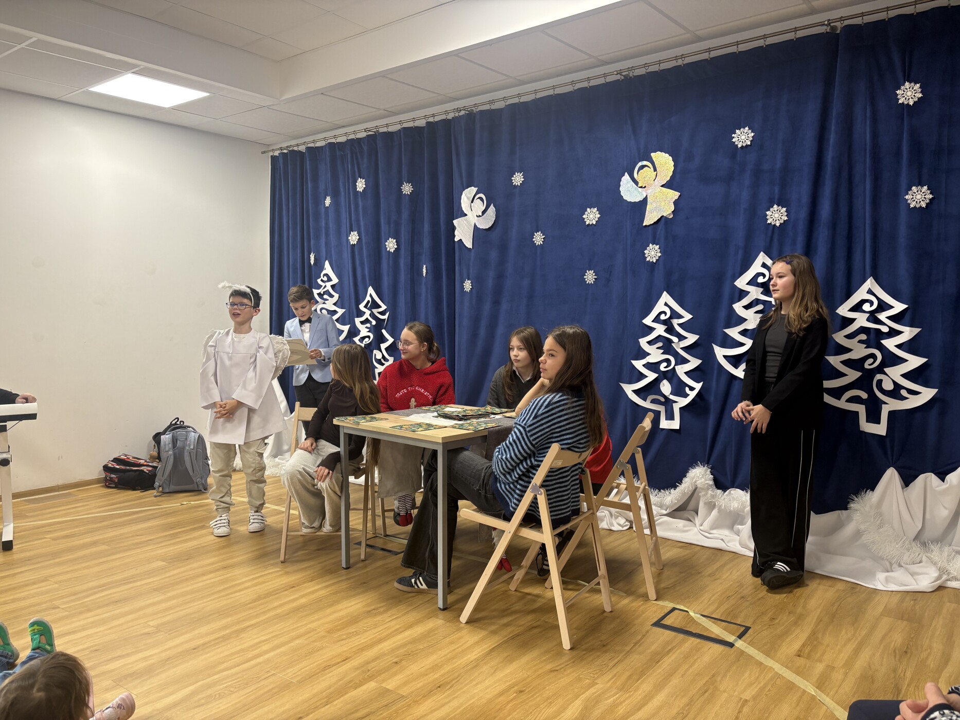 Klasa 5c przygotowała wyjątkowe świąteczne przedstawienie dla przedszkolaków. Mali widzowie z radością oglądali występy starszych kolegów, a sala wypełniła się świąteczną atmosferą, uśmiechami i ciepłem.