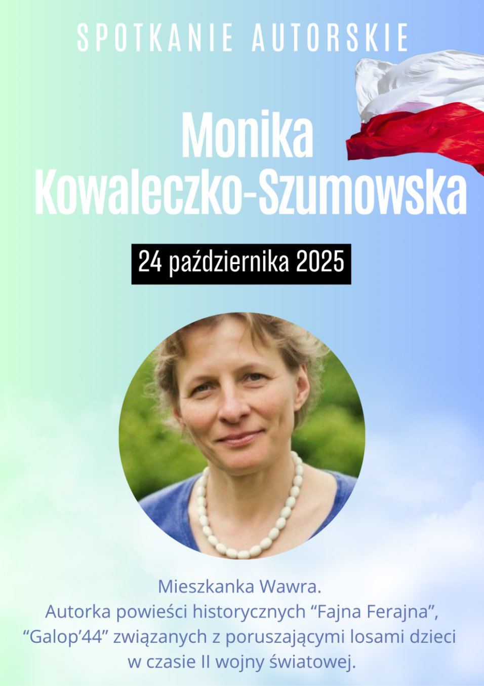 Zapraszamy jutro na spotkanie z pisarką Moniką Kowaleczko-Szumowską - autorką powieści historycznych o losach najmłodszych, mieszkanką Wawra.