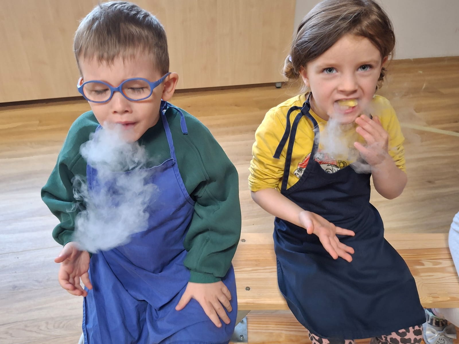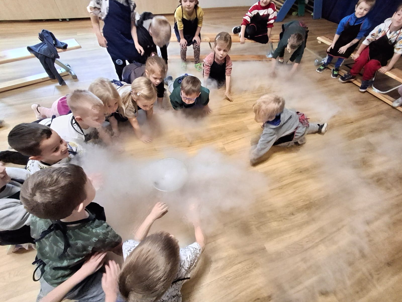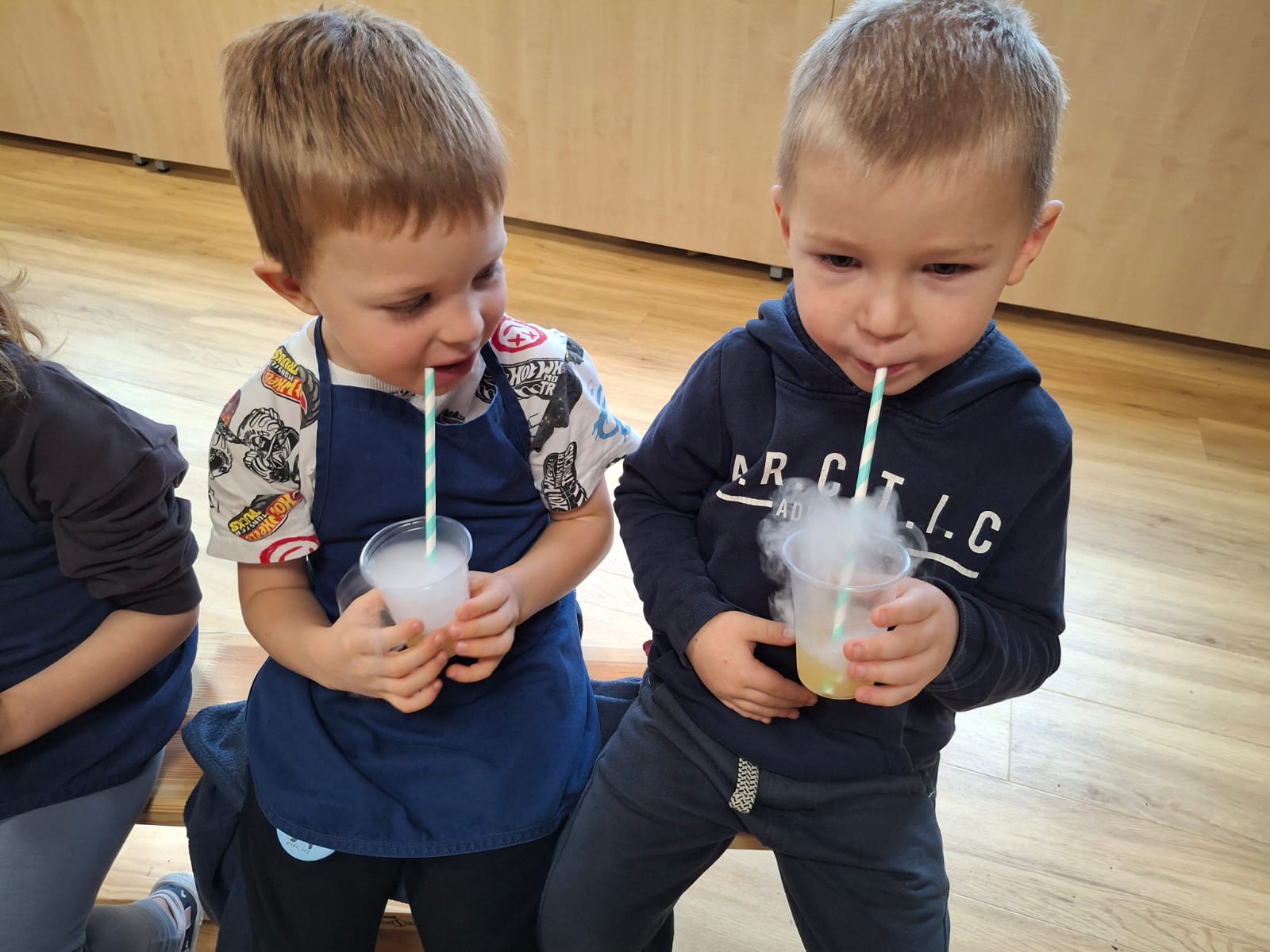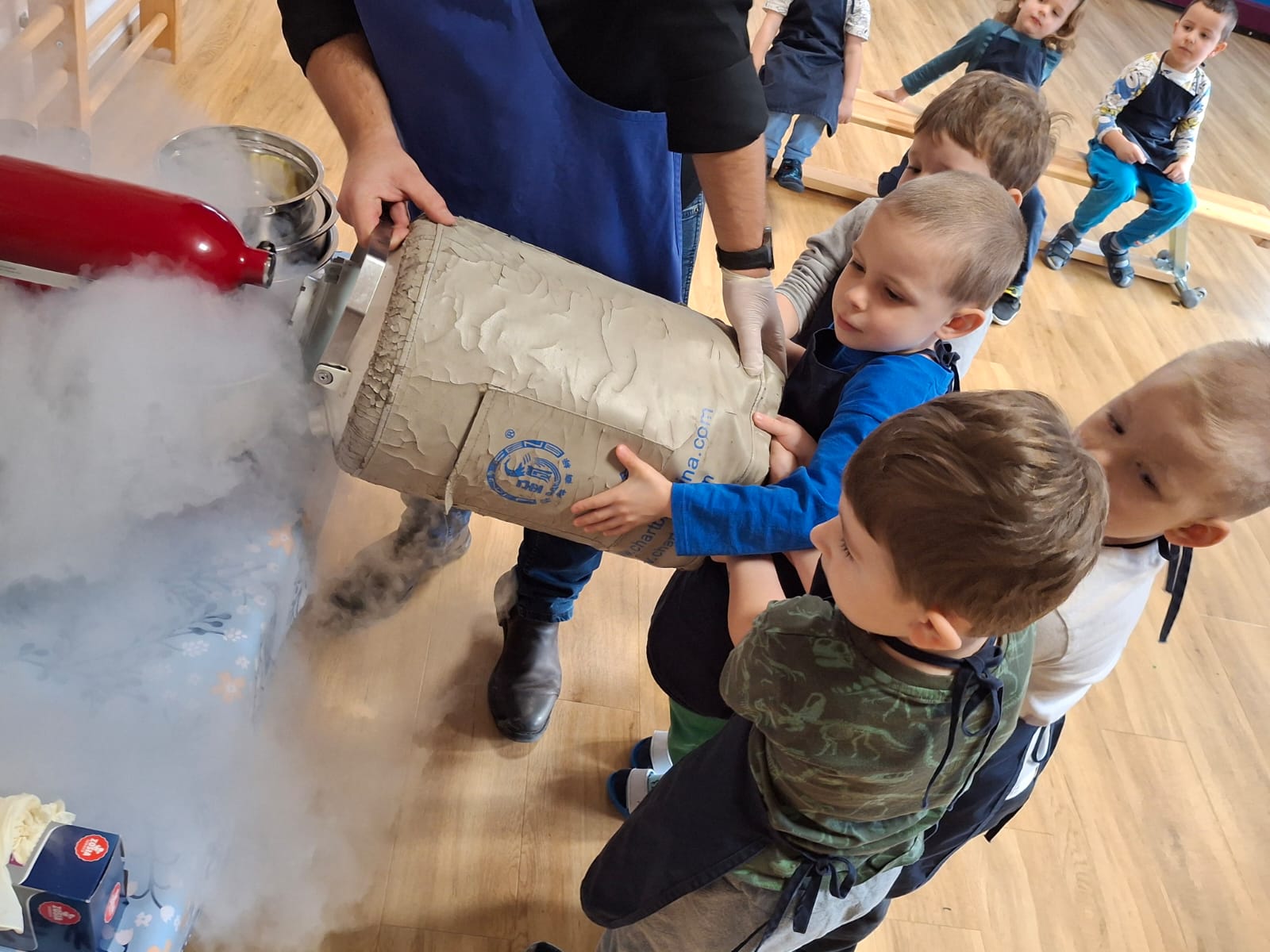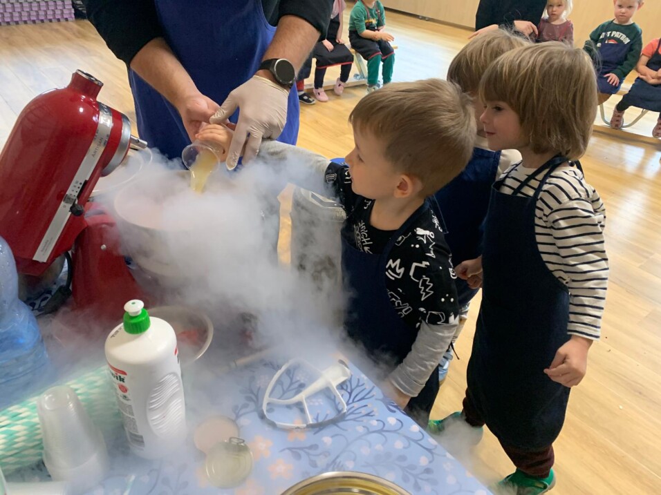 Dzieci ze wszystkich grup oddziałów przedszkolnych brały udział w warsztatach kulinarno- chemicznych. Piły " magiczny napój", jadły " mrożącego chrupka" oraz na koniec wyczarowały sorbet owocowy! Doświadczenia z kuchni molekularnej z ciekłym azotem, połączone z wrażeniami smakowymi gwarantowały świetną zabawę!