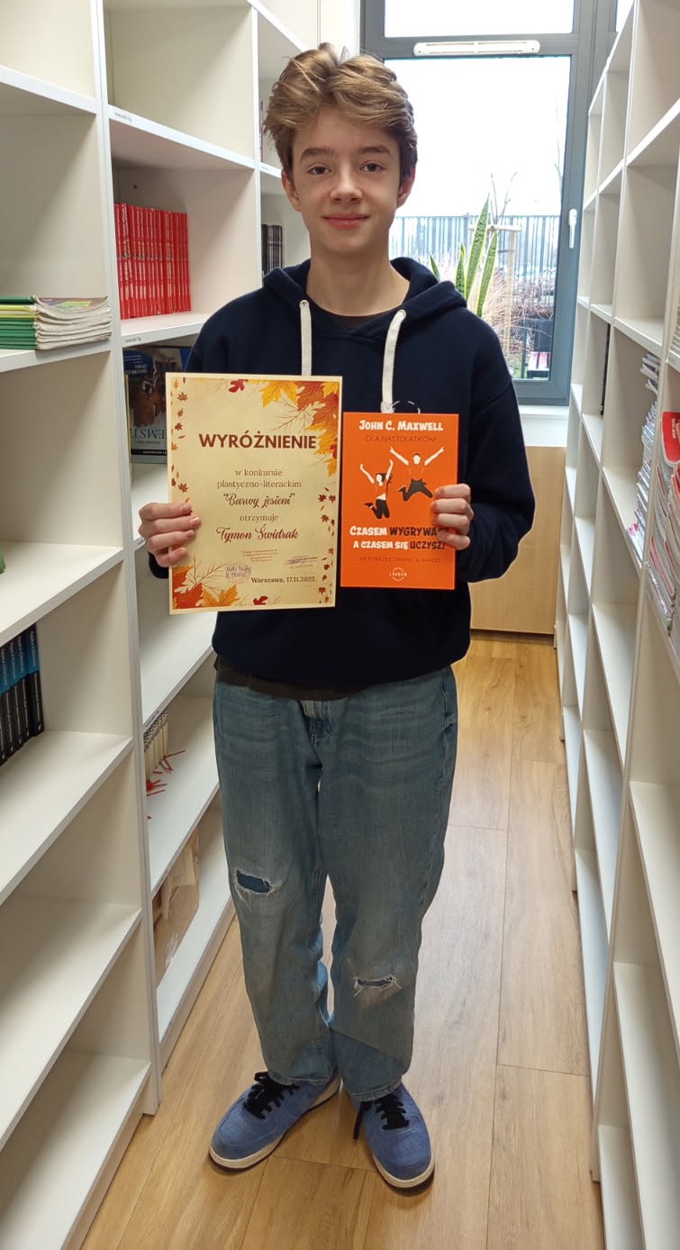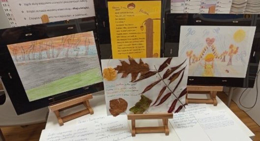 Biblioteka szkolna zorganizowała konkurs plastyczno-literacki „Barwy jesieni” dla uczniów klas 2 – 5. Chęć do udziału w konkursie zgłosił też uczeń klasy 8.